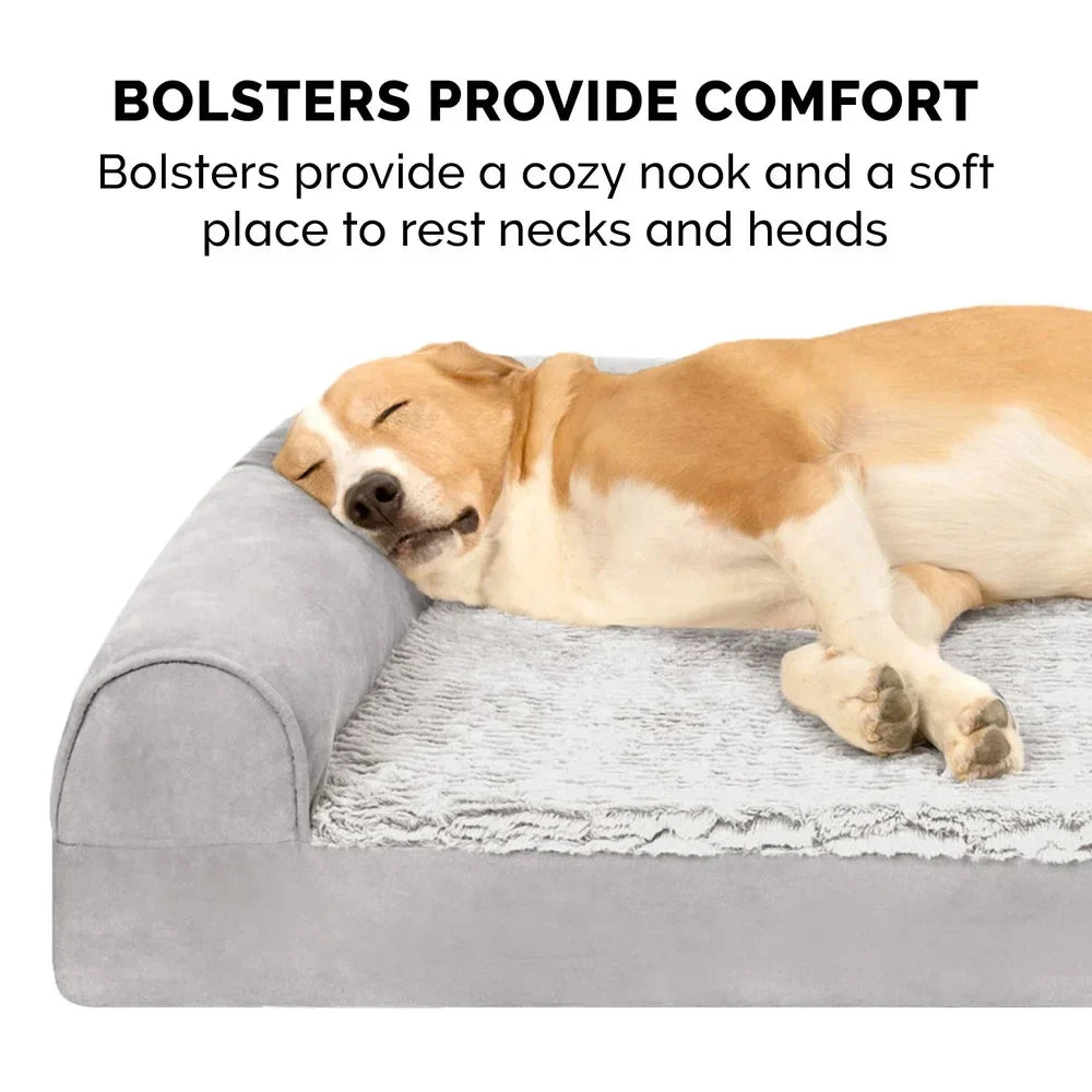 Treat your pet to ultimate relaxation with this Orthopedic Jumbo L-Chaise Dog Bed — featuring plush faux fur, suede bolsters, and joint-supporting foam for all-day coziness.